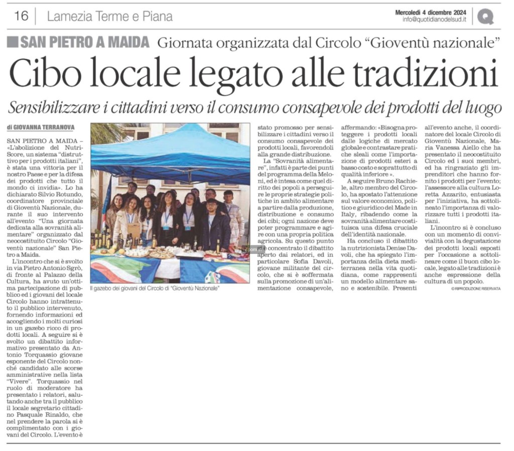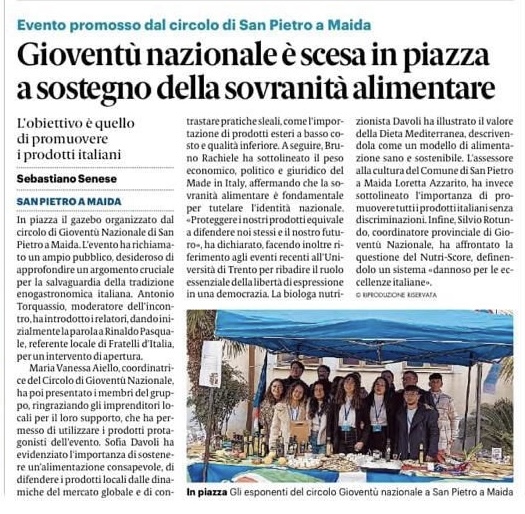 Nella giornata del 1 dicembre 2024 i ragazzi di Gioventù Nazionale hanno organizzato il primo gazebo, dedicato alla Sovranità Alimentare e al Made in Italy.