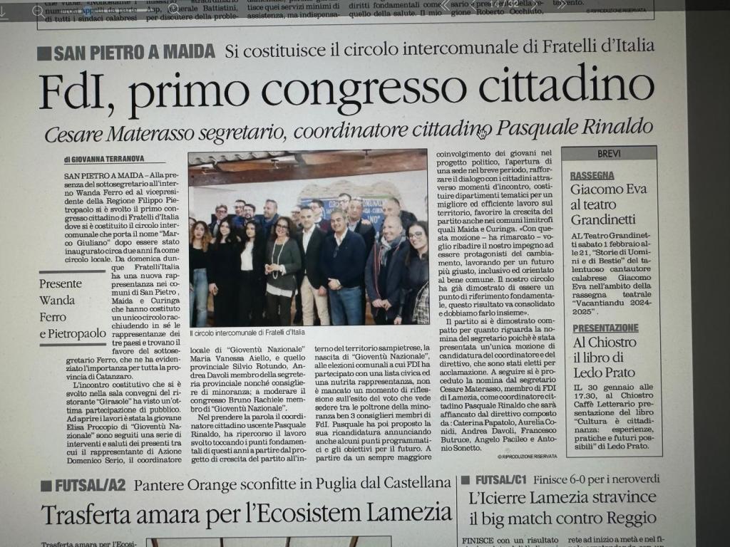 San Pietro a Maida ha vissuto un momento storico con il suo primo congresso, un evento che ha unito giovani, amministratori locali e rappresentanti politici in un confronto sul futuro del nostro territorio e sulle prospettive di Fratelli d’Italia. L’incontro è iniziato con un intervento di Elisa Procopio, membro di Gioventù Nazionale, ha esortato tutti a credere nei propri sogni e ha dato il “via” ai lavori dell’assemblea. Subito dopo, Bruno Rachiele, anche lui di Gioventù Nazionale, ha parlato del valore della nostra identità millenaria, delle tradizioni e della cultura italiana, ma ha anche sottolineato l’importanza del dialogo e dell’apertura. Questo spirito inclusivo è stato confermato dal saluto di Domenico Serio, referente provinciale e regionale di Azione. Maria Vanessa, coordinatrice cittadina di Gioventù Nazionale, e Silvio Rotundo, coordinatore provinciale, hanno rimarcato l’autonomia e la centralità del movimento giovanile per Fratelli d’Italia. Tra gli interventi, quello di Filippo Pietropaolo, assessore regionale e vicepresidente della Regione Calabria, ha spiegato come i congressi siano fondamentali per rafforzare l’unità e il confronto fra i membri di un partito e non solo. Inoltre, ha sottolineato la grande attenzione che merita la comunità nel quadro politico provinciale, mentre Andrea Davoli, della segreteria provinciale, ha parlato del circolo “intercomunale” di FdI, sottolineando l’importanza di dare un colore politico a questa importante area dell’hinterland lametino ponendo i giovani al centro del futuro del partito. Il discorso più emozionante è stato l’intervento di Wanda Ferro, sottosegretaria agli Interni. Ha evidenziato l’importanza del Circolo “intercomunale” di San Pietro a Maida – Maida e Curinga per l’intera provincia di Catanzaro, ricordando a tutti anche alcune figure storiche come Marco Giuliano, a cui è intitolato il circolo, e ha spronato i ragazzi a lottare e combattere per rendere il futuro un posto migliore. A chiudere, Pasquale Rinaldo, il coordinatore uscente, ha presentato la sua mozione e la sua ricandidatura, poi riconfermata. L’avvocato Cesare Materasso, presidente del seggio, ha ufficializzato la riconferma di Rinaldo come coordinatore cittadino e dei membri del direttivo: Andrea Davoli, Aurelia Conidi, Caterina Papatolo, Francesco Butruce, Angelo Pacileo e Antonio Sonetto. Erano presenti tanti rappresentanti dei comuni limitrofi, come Maida e Curinga, e numerosi amministratori locali.
