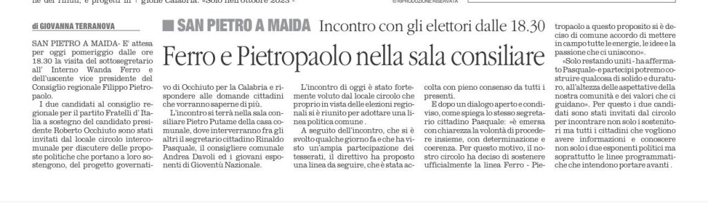 Il Circolo Intercomunale di San Pietro a Maida, Maida e Curinga ha ospitato i Candidati al Consiglio Regionale di Fratelli d’Italia Wanda Ferro e Filippo Pietropaolo.
